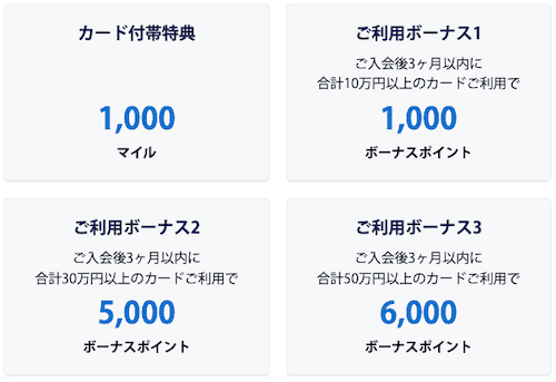 | 利用ボーナス3 | 入会後3ヶ月以内に合計50万円以上のカード利用 | 6,000ポイント |