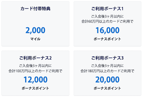 | 利用ボーナス1 | 入会後3ヶ月以内に合計60万円以上のカード利用 | 16,000ポイント |