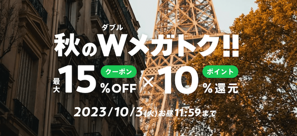 2023年秋には、15%OFFメガクーポンと10%ポイント還元のクーポンの2種類がありました。