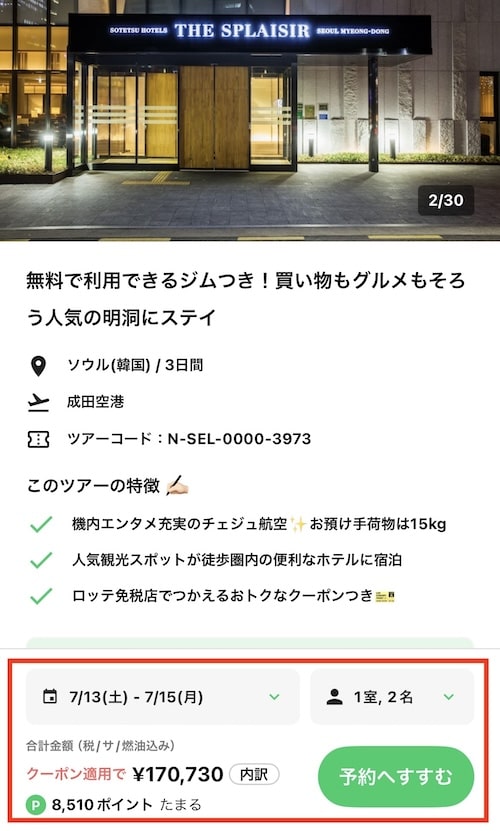 ツアーの特徴とすでに会員登録で獲得した7%OFFクーポンが適用された割引後料金が表示されます。