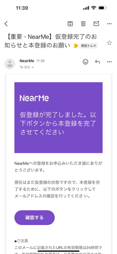 入力したメールアドレス宛に会員登録の案内が届くので、「確認する」をタップします。