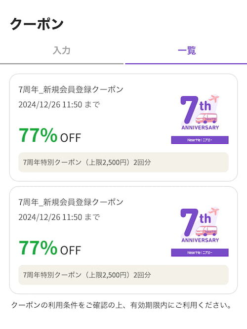 NearMeに新規登録をすると、1,000円オフクーポンが2枚で合計2,000円分のクーポンが配布されます。