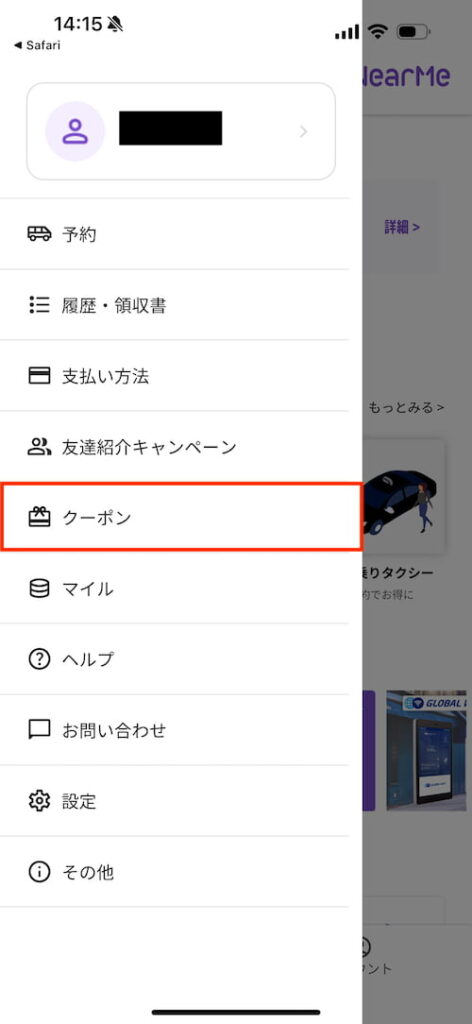 現在利用できるクーポンは、トップページの「≡」からメニューを出してクーポンを選択すると確認できます。